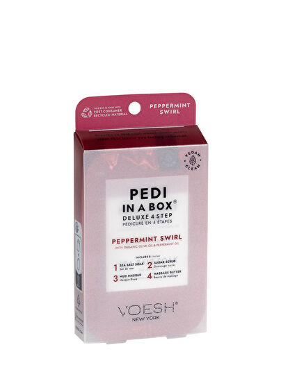 The Peppermint Swirl Pad In A Box Deluxe 4 Steps offers a pedicure experience that will revitalize and refresh you