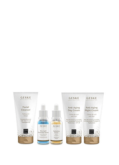 Bu 5 aşamalı uzman cilt bakım seti, cildinizi temizlikten onarıma, yoğun nemden modern tehdit olan mavi ışık korumasına kadar 24 saat boyunca ileri seviye yaşlanma karşıtı bakım altına alır