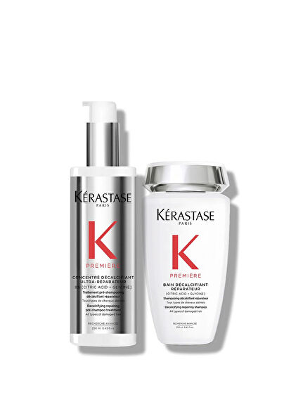 Kérastase Première Bain Décalcifiant Réparateur sülfatsız şampuanın maksimum etki için Kérastase Concentré Décalcifiant Ultra-Réparateur'ün üzerine durulanmadan uygulanması önerilir