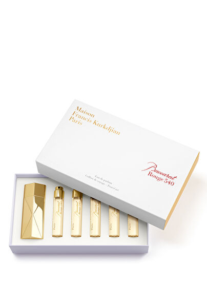 Baccarat Rouge 540 eau de parfum seyahat seti, Maison Francis Kurkdjian ile kristal üreticisi Baccarat arasındaki karşılaşmayı kutlayan, son derece yoğun ve canlı bir koku imzası sunar