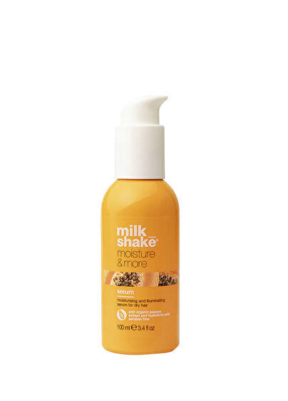 milk_shake moisture&more serum, kuru ve mat saçlara anında nem ve parlaklık kazandırmak için geliştirilen, durulanmayan hafif yapılı bir saç bakım serumudur