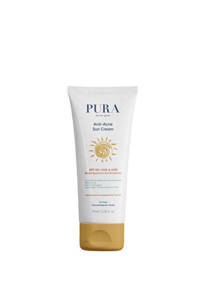 Pura SPF 50+ Geniş spektrumlu akne karşıtı güneş koruyucu krem 75 ml, Anti-Akne SPF 50 Güneş Koruyucu Krem, akne eğilimli ciltler için geliştirilmiş özel bir formüle sahiptir